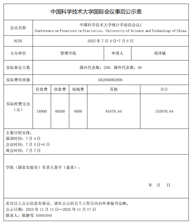 中国科学技术大学国际会议事后公示表(统计学前沿会议)