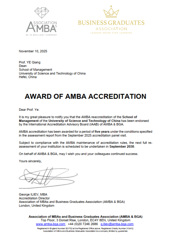 2025年11月10日,中国科学技术大学管理学院正式收到英国工商管理硕士协会(Association of MBAs,简称AMBA)的贺信,宣布学院成功通过AMBA 2025年再认证,再次获得五年最高期限。此次认证是学院继2016年获得AMBA认证、2020年首次通过再认证之后,第三次通过该项认证。