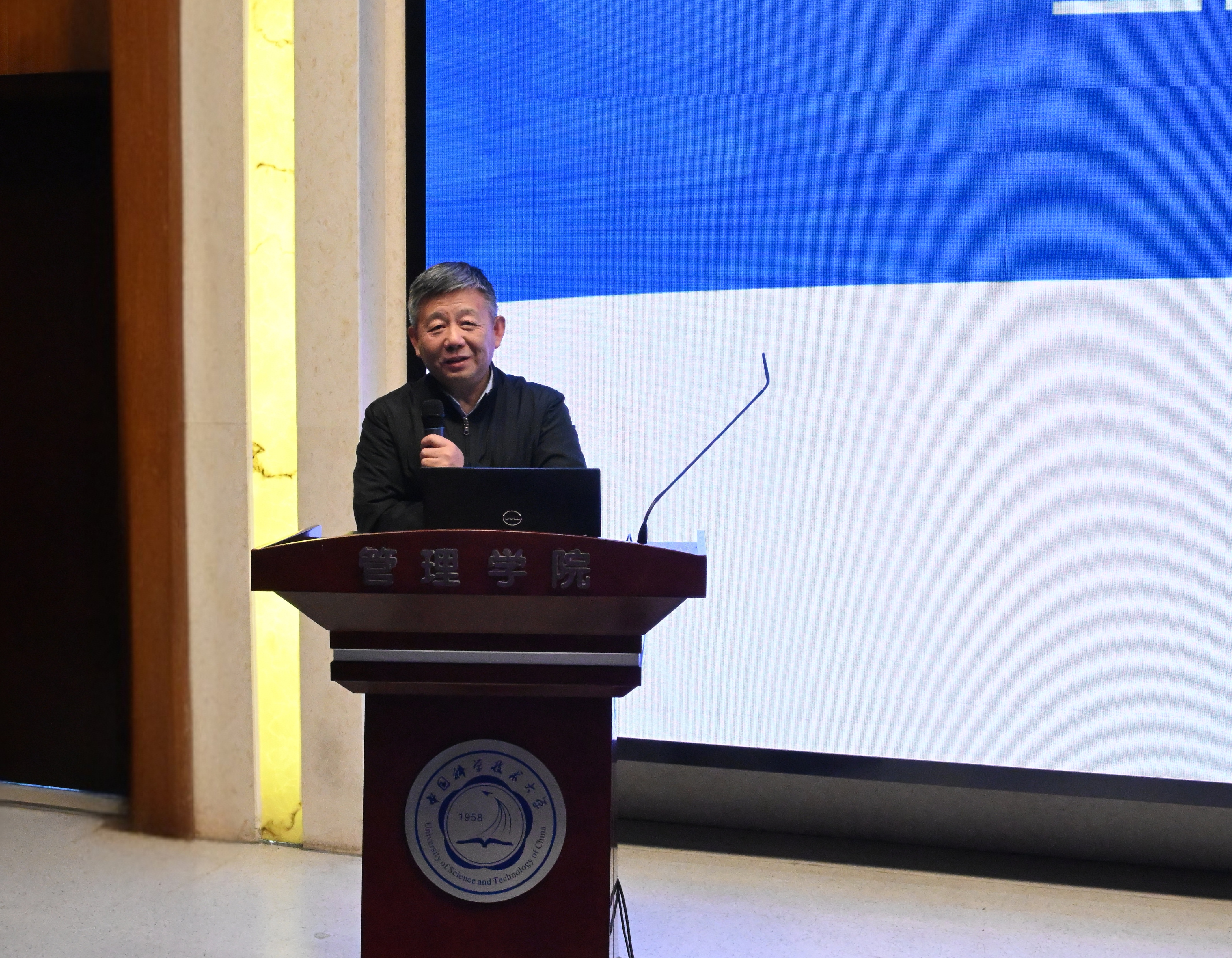 1月15日,科技商学院、管理学院和公共事务学院共同主办,特邀杰出学者梁樑教授作管理科学学科发展战略研究主题报告,聚焦人工智能时代国家科创战略深入推进的背景下,管理学科如何重新锚定核心使命与发展方向。这场深刻而前瞻的战略报告会,拉开了老师们共同思考、谋划学科未来发展的序幕。报告会由校党委常委、组织部部长申成龙主持。科技商学院、管理学院,公共事务学院全体教师现场聆听报告。
