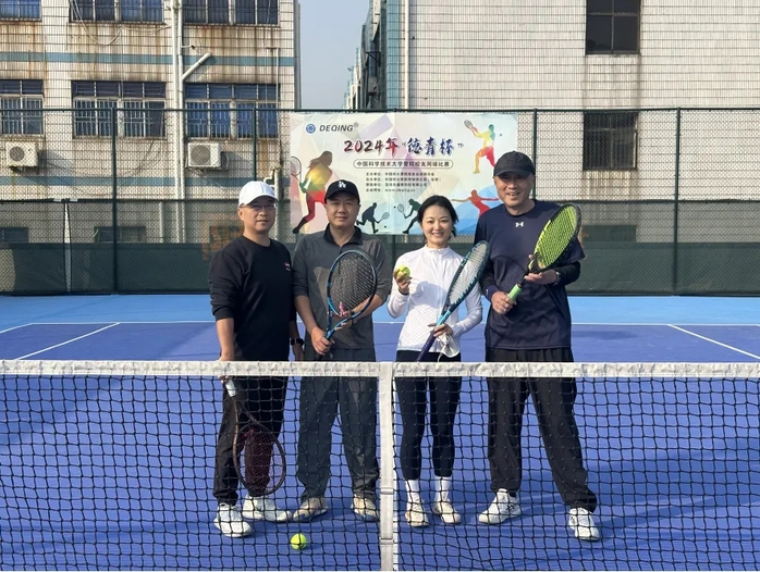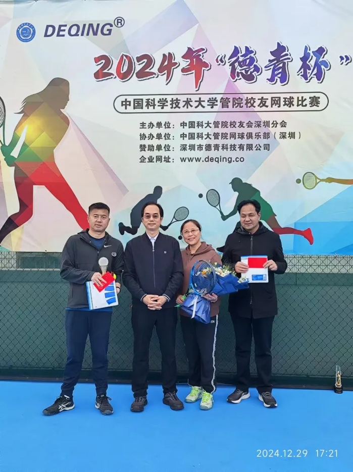 2024年“德青杯”网球赛由2004级MBA曾德群校友的公司——深圳市德青科技有限公司独家赞助。分设男双、混双两项冠亚军。中国科大管院深圳校友会会长谷旭东和校友会秘书长常荣莅临现场观看比赛并为现场球员送上厚礼。