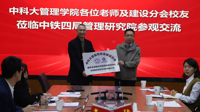 会议的最后,双方举行了隆重的授牌仪式。中国科大管理学院校友会建设分会与安徽数智建造研究院有限公司联合成立建筑业数智化转型联合研究中心,标志着双方在人才培养、科研合作、学术交流等方面建立更为紧密的合作关系,共同推动企业管理领域的创新与发展。