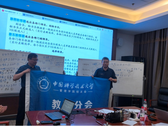 科大管理学院校友会教育分会执委会的交旗仪式将整个活动推向了高潮,本届会长封安保和新一届会长吕劲参与了交旗仪式。随后,新一届会长吕劲进行了致辞,他表示,在校友办的指导下,教育分会将继续传承优秀传统,以强烈的事业心和责任感,在教育发展、活动组织、学习提高等方面把校友工作做得更加扎实。换届是新的开始,也是新的挑战,本次选举活动的圆满举行标志着新一届中国科大管理学院校友会教育分会执委会将正式接棒,新的团队将继续发扬“红专并进 理实交融”的科大精神,勇于创新实践,共同书写教育分会的新篇章。