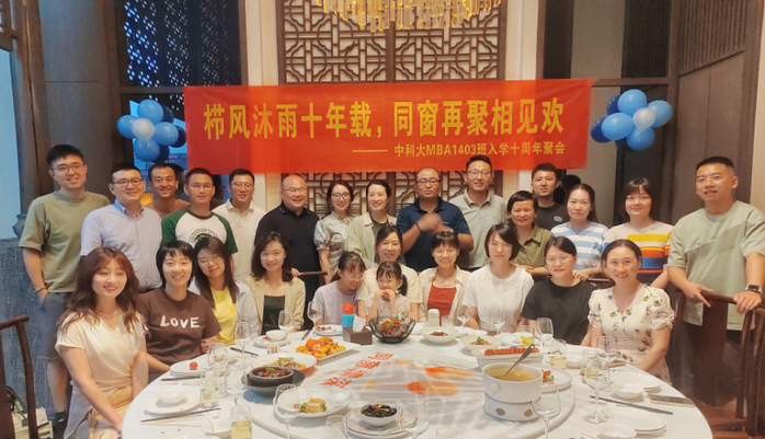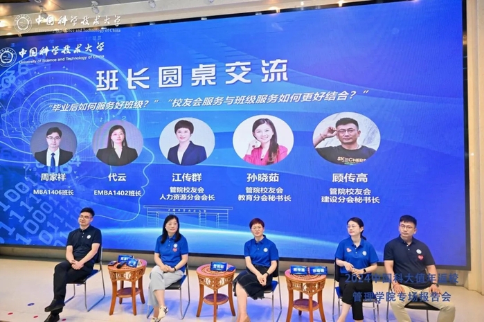 接下来是圆桌交流环节。班长代表MBA1406班周家祥、EMBA1402班代云;校友分会代表管院校友会人力资源分会会长江传群、教育分会秘书长孙晓茹、建设分会秘书长顾传高,围绕“毕业后如何服务好班级”和“校友会服务与班级服务如何更好结合”进行深入讨论。服务创造价值。为大家服务是班级和校友组织的初心,大家互帮互助、凝聚壮大,才能走得更远。