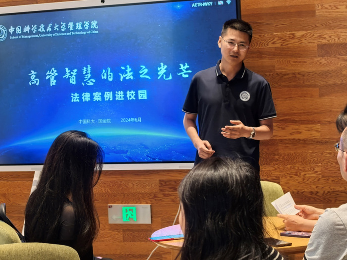 6月23日,中国科大管理学院创新实践协会联合中国科大管理学院校友会法律分会在国金院五号楼一楼阅读空间举办了一场“高管智慧的法之光芒—法律案例进校园”活动。参会人员为创新实践协会成员、2022级和2023级在校生以及法律分会部分校友。