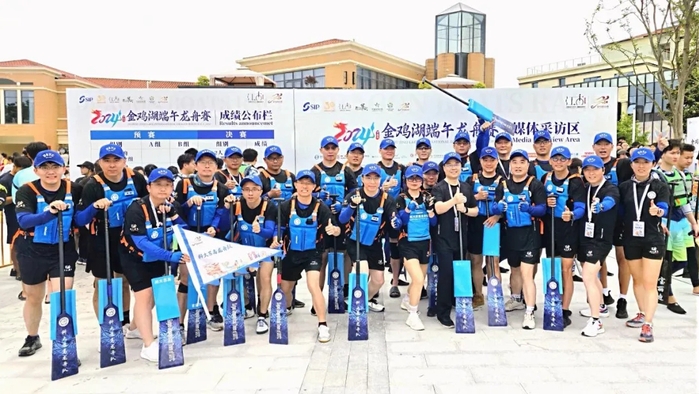 端午节这一天,科大苏高龙舟队迎来了2024金鸡湖端午龙舟赛。22人龙舟公开组300米直道竞速项目,该项目共有14支队伍同场竞技。经过第一轮预赛的激烈比拼,科大苏高龙舟队以第五名的成绩成功晋级决赛。在作为赛事压轴大戏的决赛中,经过一场紧张刺激的角逐,科大苏高龙舟队最终获得了第七名,并因此荣获金鸡湖端午龙舟赛的优胜奖。