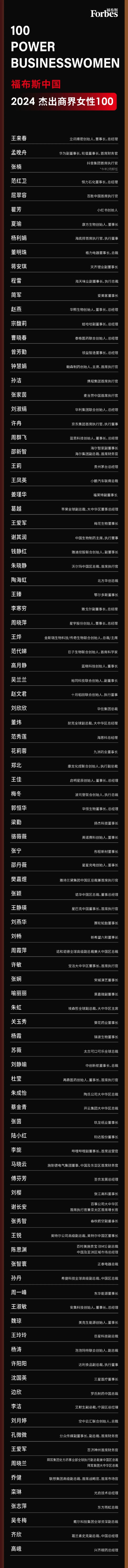 这是福布斯中国第十次发布“福布斯中国杰出商界女性100”。其希望通过这份榜单呈现中国商业世界的女性群像:”她们是女儿、是妻子、是母亲,也是千亿市值掌舵者;她们勇于探索科技无人区,也深信努力比选择更重要。“