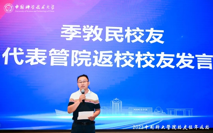 报告会还特别安排了管院返校校友代表季敩民发言环节。季敩民校友代表了管院返校校友的心声,感谢母校和各位老师的培养,同时分享了个人的成长和职业经历,号召校友们时刻关注母校动态,鼓励校友加强联合和合作,积极参与校友活动,共同为母校的发展贡献力量。