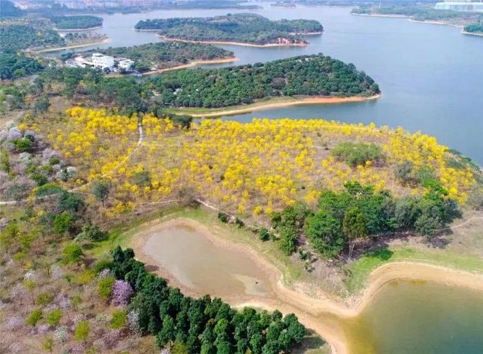 三月的东莞松山湖,春风渐暖,百花盛开,莞城尽带风铃木。200亩黄花风铃木绽放,俯览仿佛一片黄色海洋。黄花风铃木花色金黄,花冠似风铃,微风吹拂,轻盈的花枝在风中摇曳,恰如一串串风铃随风起舞,美不胜收。
