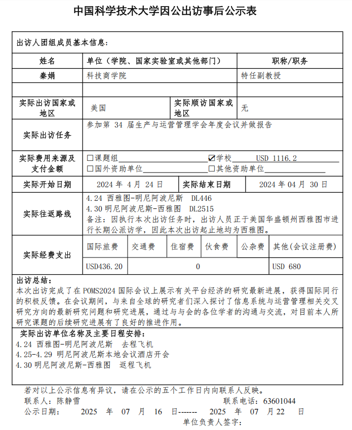中国科学技术大学因公出访事后公示表 (秦娟)