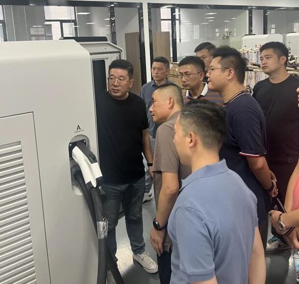 在校友程立春(EMBA1901)的带领下,校友们深入了解了企业在配件选型、产品定位及新能源解决方案等领域的布局与实践。通过生动讲解与互动体验,校友们对交直流充电桩、柔性矩阵充电堆以及液冷超充技术有了直观且深入的认识,进一步明晰了新能源充电领域的技术发展方向。