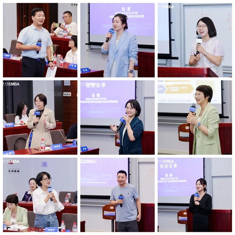 共创作者分享环节,黄柏松、姜珊晴、吴赛群、孙皖宁、刘漫、云璐、靖燕、许琳等八位来自不同行业的校友,依次分享了他们的课程感悟与生命实践。他们的故事印证了赵征老师的观点:“真正的学问是解决自己问题的学问”。从国企电商转型的困惑,到陪伴患病母亲的人生低谷;从企业战略与人力资源管理的实践,到家庭教育中“兜底”的智慧;从新能源创业的预判与试错,到特殊教育领域用管理智慧照亮“星星的孩子”……每一位分享者都从课程中一个微小的切入点(800字作业)出发,将管理思维内化于心、外化于行,实现了知识与生命的深度融合。
