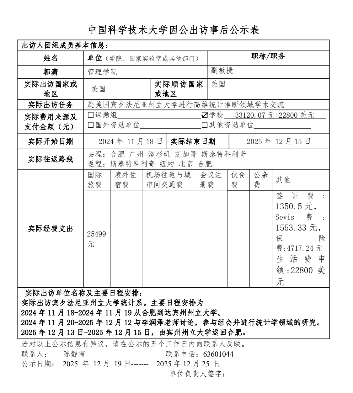 中国科学技术大学因公出访事后公示表(郭潇)