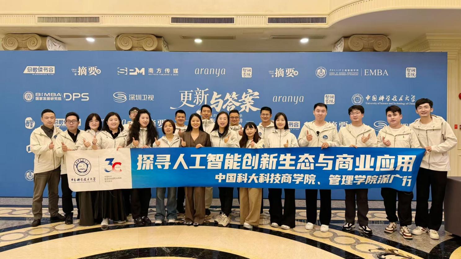 2025年12月11日至13日,中国科学技术大学科技商学院、管理学院组织30多位EMBA、MBA等专业学位师生走进粤港澳大湾区核心城市深圳与广州,开展以“科商引领 智瞰湾区”为主题的人工智能创新生态与商业应用深度研学活动。本次活动由EMBA中心副主任范秀、专业学位办职业发展与就业主管吴晖老师、EMBA中心招生主管朱荣嘉老师全程带队,由中国科大管理学院创新实践协会承办,精心遴选中国科大校友标杆企业,通过企业参访、主题分享、研讨交流、学术高地对话、校友互动等多个维度,为学员搭建了链接科技前沿、商业实践与未来趋势的立体化学习平台。