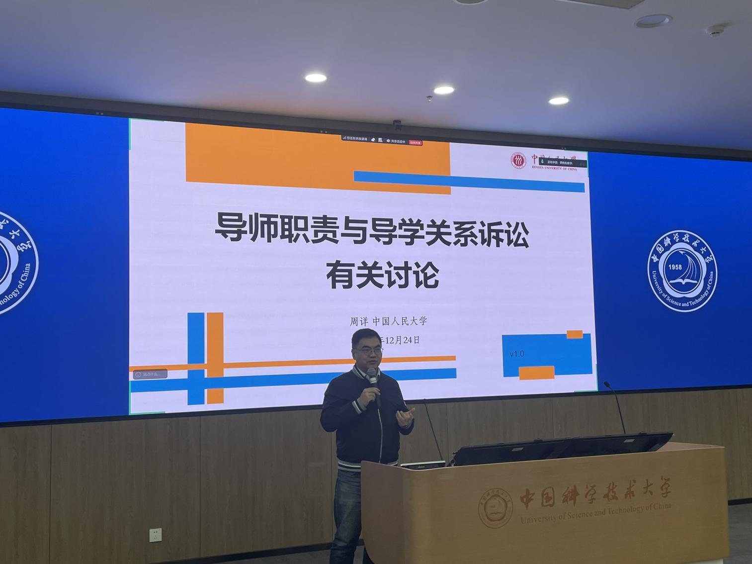 接下来,中国人民大学周详教授作题为“导师职责与导学关系诉讼有关讨论”专题报告。他围绕制度规范、法律框架、程序正义等维度,结合案例系统阐释了导学关系中可能出现的法律风险与争议焦点,强调了学位法与相关准则对导师职责的法定要求,提醒导师应恪守师德、依法履职,实现育人成效与法治要求的统一。