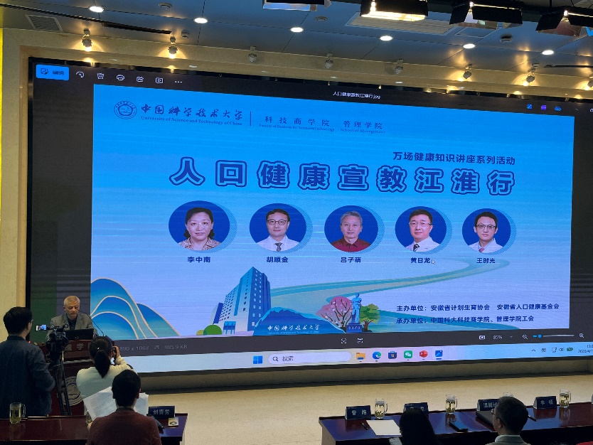 4月10日下午,“人口健康宣教江淮行”活动在中国科学技术大学东校区管理科研楼二楼报告厅举行。本次活动由安徽省计划生育协会、安徽省人口健康基金会主办,中国科学技术大学科技商学院、管理学院工会承办,以“知‘心’防猝,未病先治”为主题,旨在普及健康知识、推广中医药文化,助力健康校园与健康中国建设,来自全校的百余名师生参加活动。