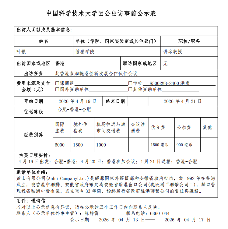 中国科学技术大学因公出访事前公示表(叶强)